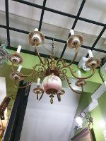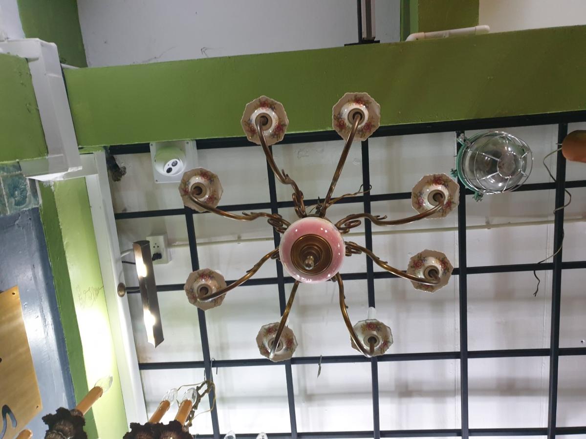 โคมไฟกระเบื้องเก่า สีชมพูลายดอกไม้แขนทองเหลือง 8แขน นำเข้าจากเยอรมัน สนใจโทรสอบถามได้ที่ 02 570 1987 ฝ่ายขาย 061 509 5337,065 551 5945